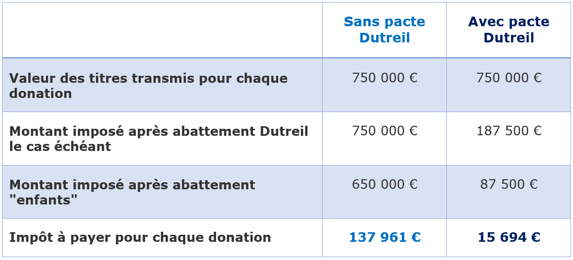 Cela signifie qu’une fois mis en place dans votre société, le pacte Dutreil vous permet de réduire considérablement l’impôt à payer au Trésor Public si vous décidez de transmettre à vos proches les parts sociales ou les actions de votre société. Comme le barème des droits de mutation à titre gratuit est progressif (art. 777 du CGI), l’abattement d’assiette du pacte Dutreil permet des économies d’impôts supérieures à 75 %.