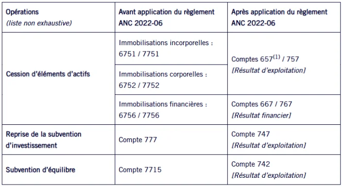 Le plan de comptes a été modifié en conséquence, avec la création de nouveaux comptes. Certaines opérations, auparavant comptabilisées en résultat exceptionnel (comptes 67 et 77), sont désormais enregistrées en résultat d’exploitation ou financier.