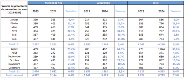 Le nombre de mandats ad hoc augmente de +6,6% par rapport à 2023. L’augmentation globale des procédures de prévention est de +7,3% par rapport à 2023.