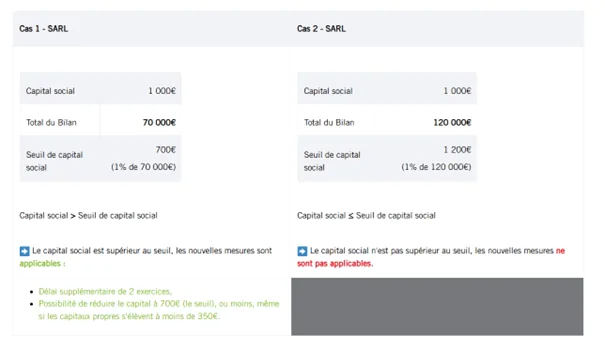 Lorsque les sociétés commerciales ci-dessus décrites sont placées en sauvegarde ou en redressement judiciaire, ou sont déjà bénéficiaires d’un plan de sauvegarde ou de redressement, elles ne sont pas soumises au régime spécial de la « perte de la moitié du capital » prévu par le droit des sociétés.