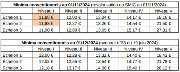 - Sur le plan salarial, la revalorisation du SMIC à effet du 1er novembre 2024 a rattrapé les minima conventionnels des échelons 1 et 2 du niveau I. La prise en compte de l’expérience professionnelle conduira à une revalorisation salariale avec l’entrée en vigueur depuis le 1er décembre 2024 de l’avenant n° 33 du 19 juin 2024 revalorisant les minima conventionnels.